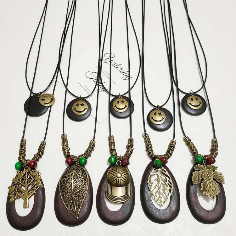New Chinese Zen Style Ancient Bronze Leaves Woolen Chain Bohemian Ethnic Style Double-Layer Overlapping Long Necklace for Women