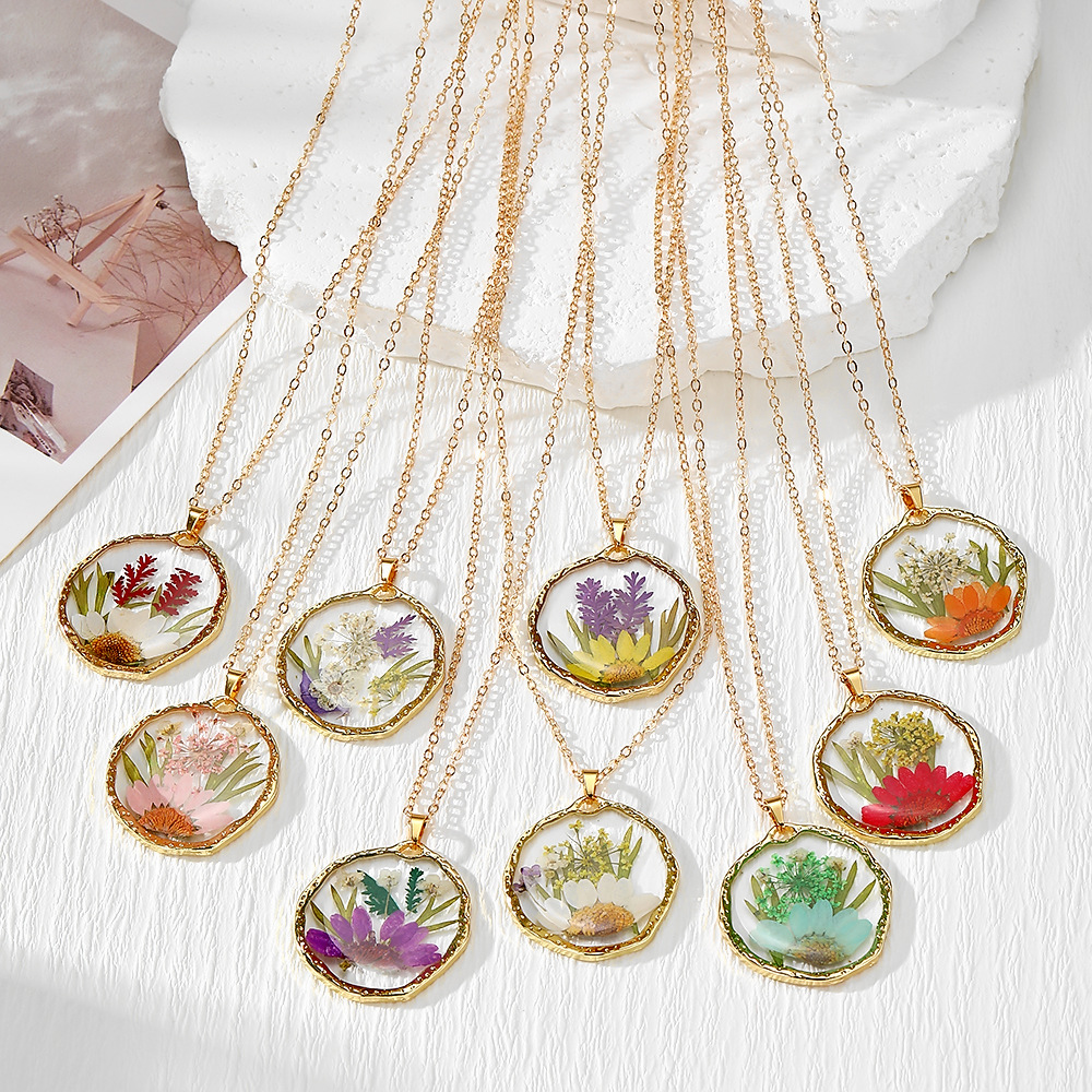 Cross-Border European and American Bohemian Natural Round Dried Flower Transparent Necklace Colorfulful Flower Glue Pendant Clavicle Chain