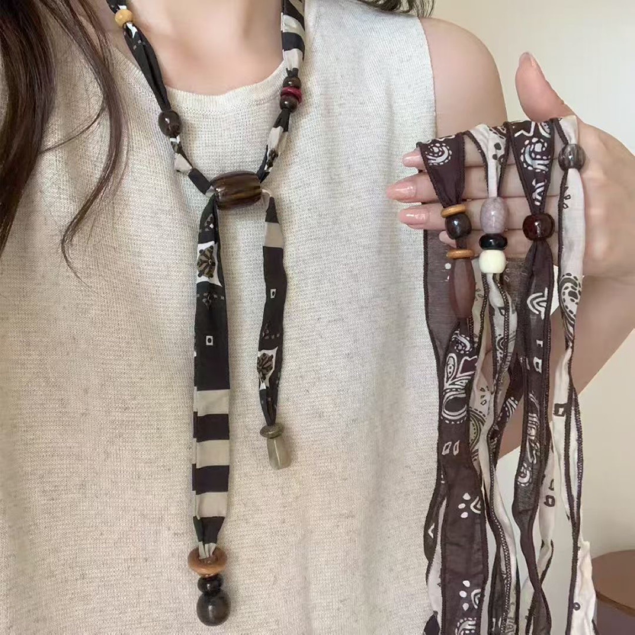 Bohemian Ethnic Style Cashew Silk Scarf Fabric Wooden Bead Necklace Women's Unique Design Sweater Chain Accessories Necklace