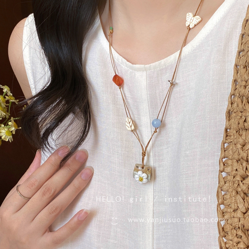New Chinese Style Ceramic Small Flower Necklace for Women Bohemian Ethnic Style Long Pull-Out Adjustable Sweater Chain Accessories