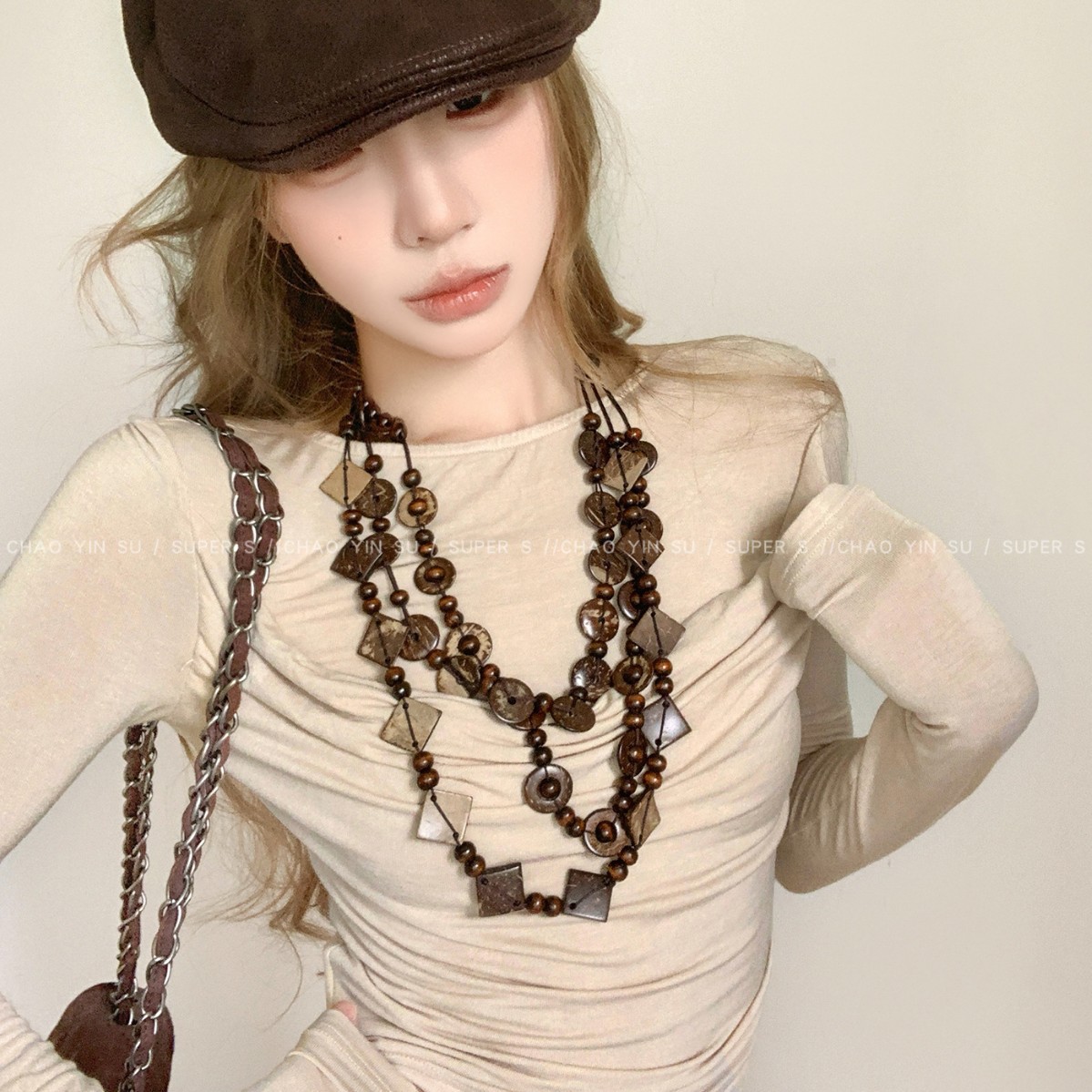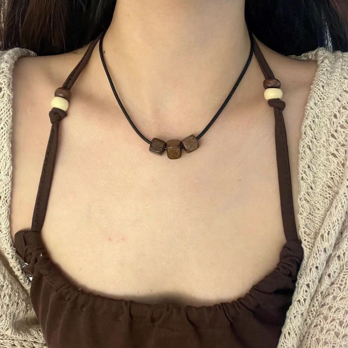 Bohemian Retro Style Braided Rope Wooden Beads Beaded Necklace Women's Niche Design Versatile Non-Fading Women's Sweater Chain