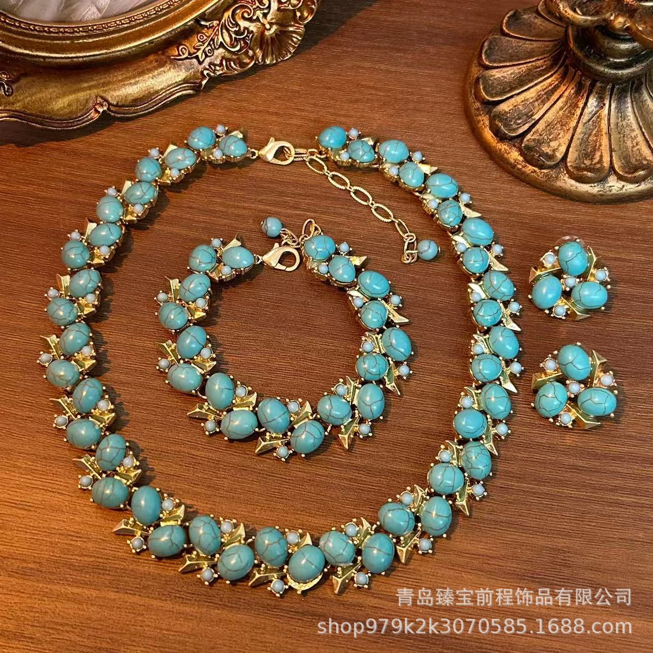 European and American Retro Design Turquoise Trifari Cuifali vintage Middle Ancient Necklace Bohemian Earrings