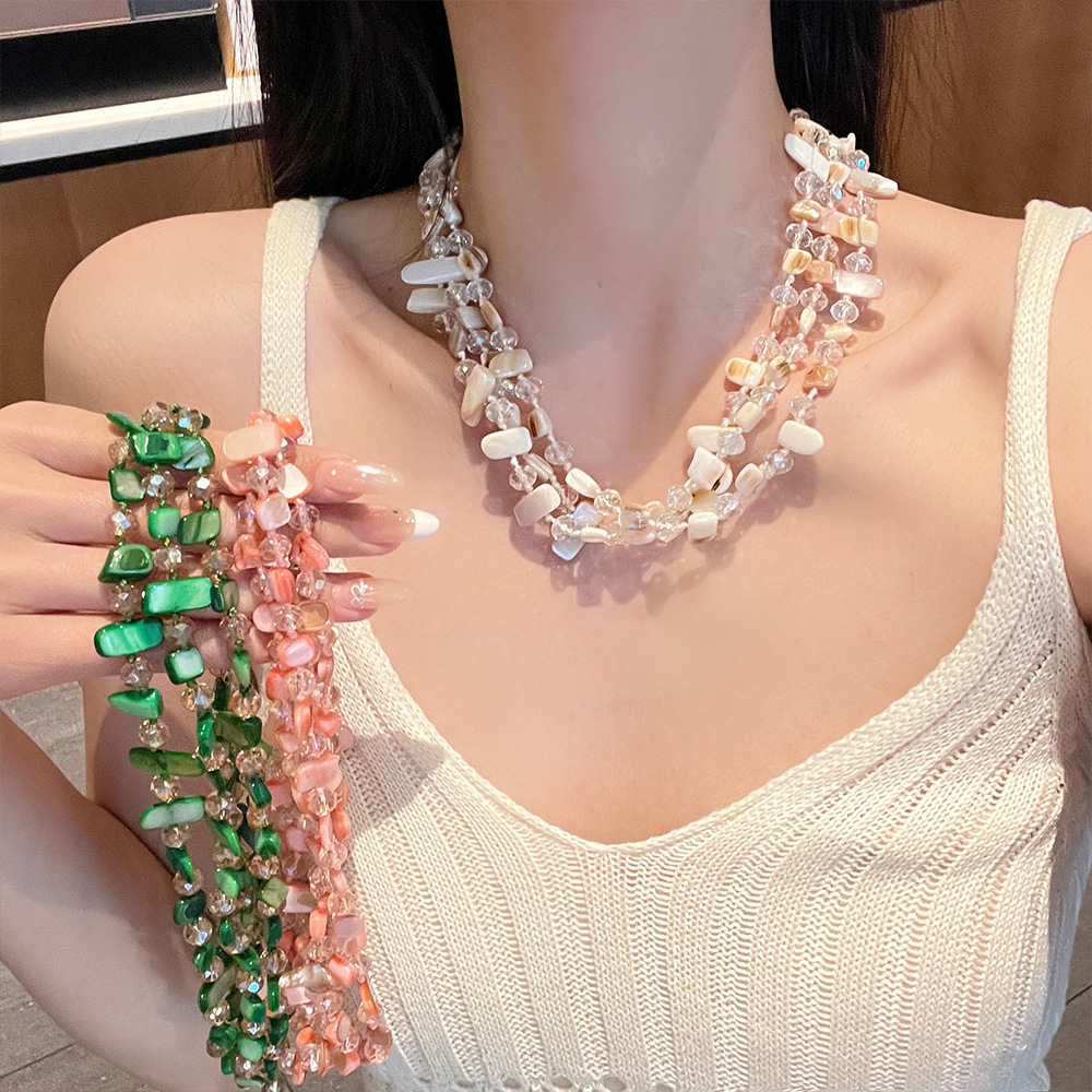 Bohemian Style Green Natural Shell Necklace for Women, Vintage Double-Layer Sweater Chain with a High-End Feel Accessory