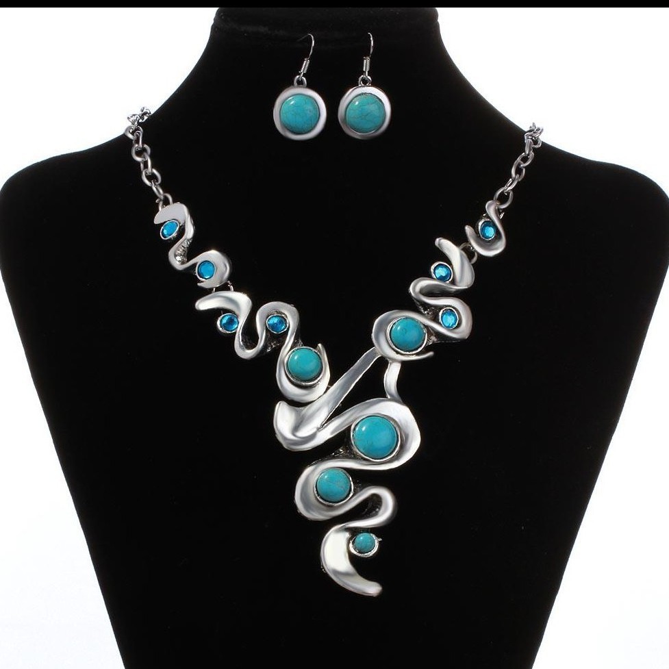 Mogo Amazon Bohemian ethnic style retro turquoise Xizang silver necklace earrings chain wholesale