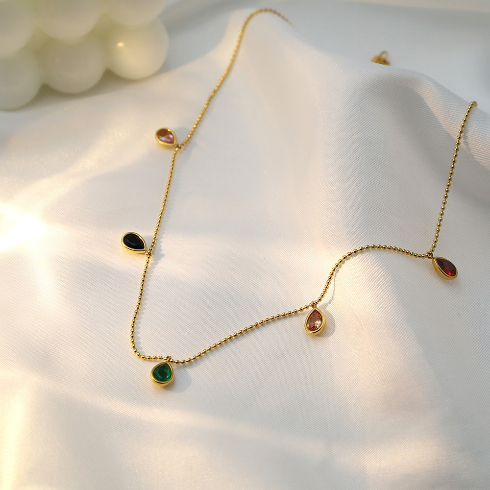 Bohemian style multi-color contrast color water drop shape zircon clavicle chain necklace women's fashion titanium steel jewelry