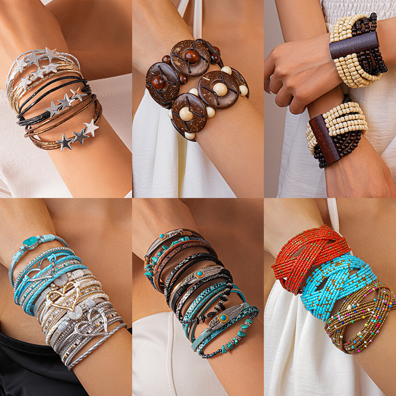 European and American Cross-Border Coconut Shell Braided Rope Heart Leather Multi-Layer Bracelet Bohemian Bracelet Ethnic Style High-End Jewelry