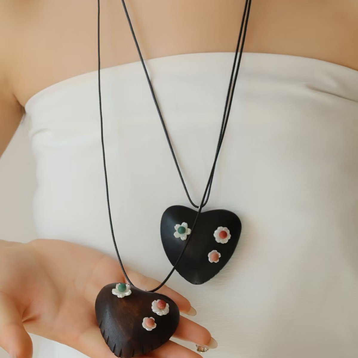 Love Flower Wood Pendant Necklace for Women Bohemian Holiday Style Long Clavicle Chain Retro Ethnic Necklace for Women