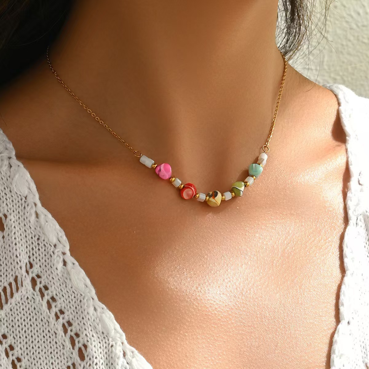 Bohemian Dopamine Color Natural Stone Beaded Necklace Cross-border Simple All-match Stainless Steel Collarbone Necklace