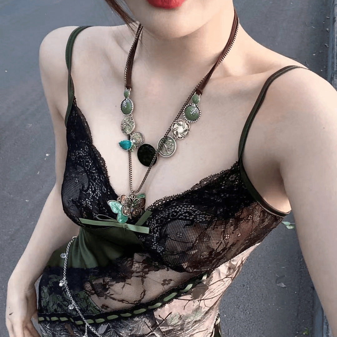vintage Bohemian Green Necklace Antique Twin Butterfly Clavicle Chain Unique Antique Necklace Chain