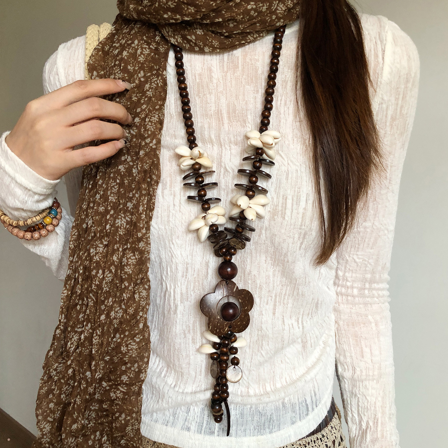 Retro Bohemian Style Coconut Shell Flower Beaded Necklace Women's Ethnic Style Niche Sweater Chain Long Holiday Accessories