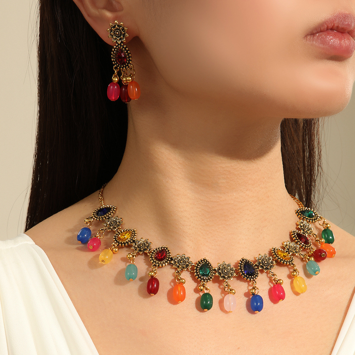Xl-004 European and American Cross-Border Ethnic Bohemian Shiny Retro Necklace Set Earrings with Unique Color-Blocking Ethnic Style