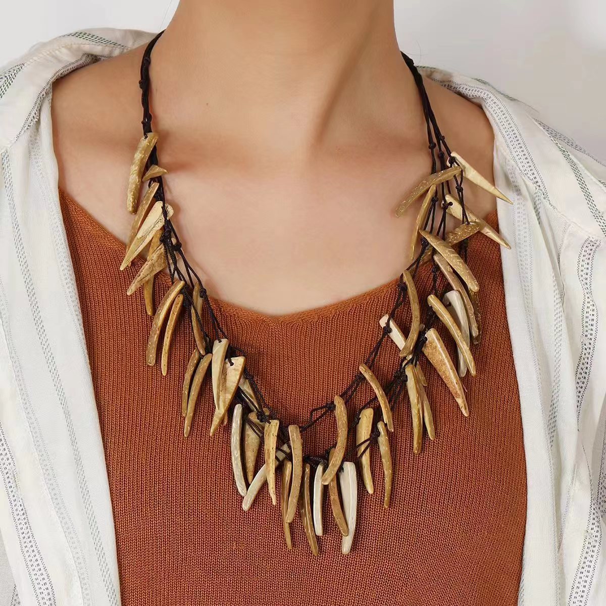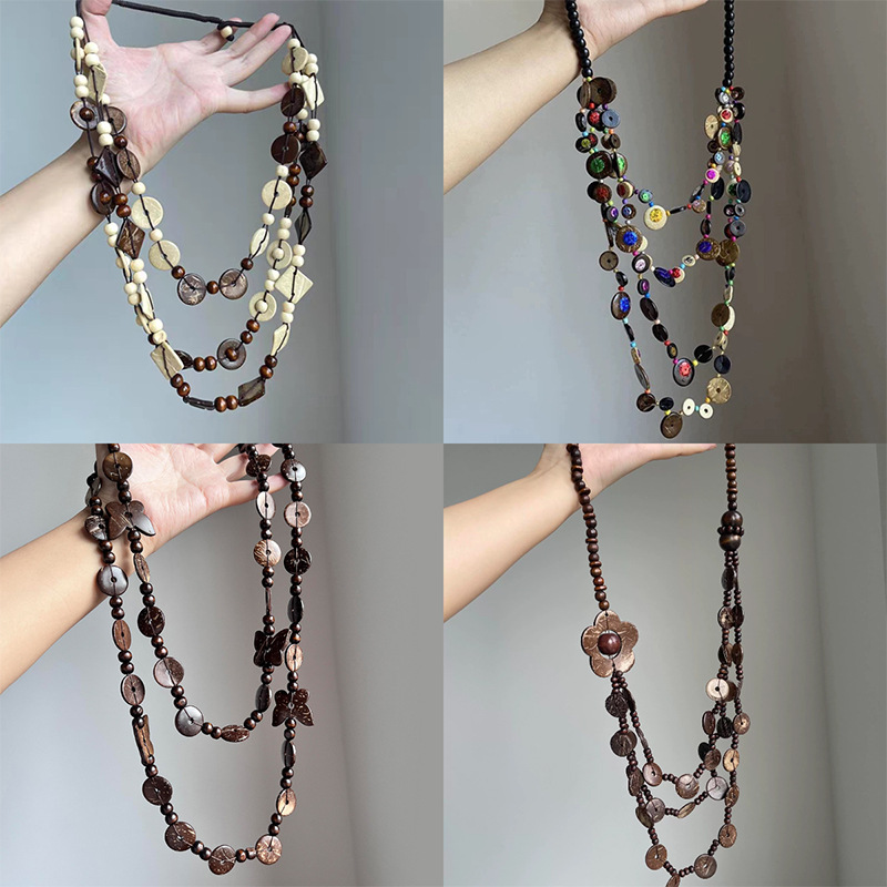 Travel Accessories Exotic European and American Bohemian Ethnic Retro Long Tooth Coconut Shell Sweater Chain Long Necklace Wholesale