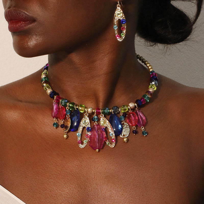 Bohemian Style Colorful Crystal Beaded Necklace Retro Multi-Colorful Gemstone Pendant Necklace Sparkling Diamond Exaggerated Clavicle Chain
