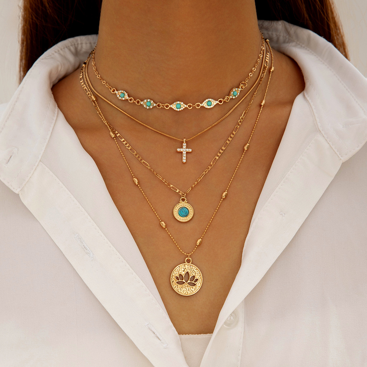 Bohemian Style Retro Flower Cross Necklace for Women, Niche Simple Multi-Layered Layered Clavicle Exaggerated Necklace