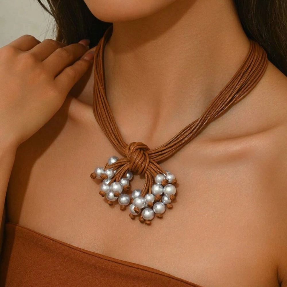 European and American Cross-Border Flow Bohemian Style Pearl Tassel Braided Necklace Retro Wax Rope Tassel Pendant Necklace for Women