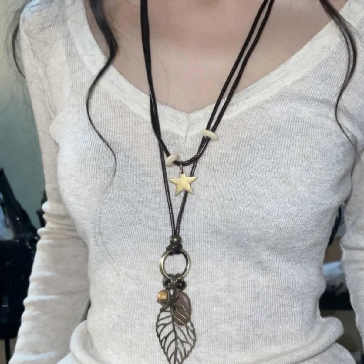 Vintage Bohemian Style Hollow Leaf Pendant Necklace for Women, New Chinese Style Versatile Long Double-Layer Sweater Chain Accessory