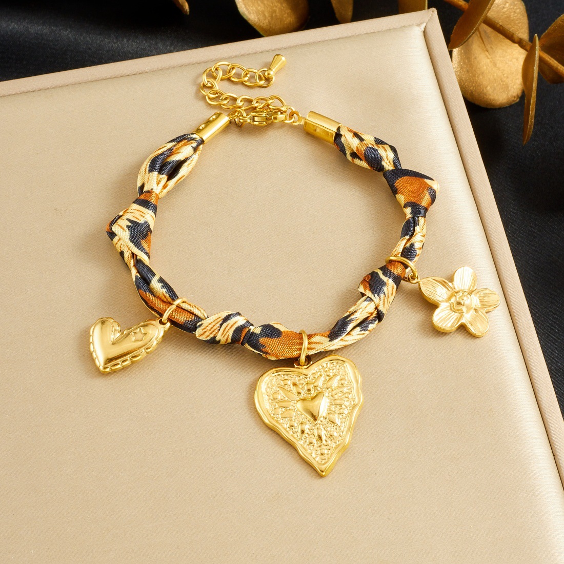 Fashion Vintage Print Leopard Ribbon Knotted Rope Chain Gold Plated Flower Heart Pendant Stainless Steel Jewelry Bracelet
