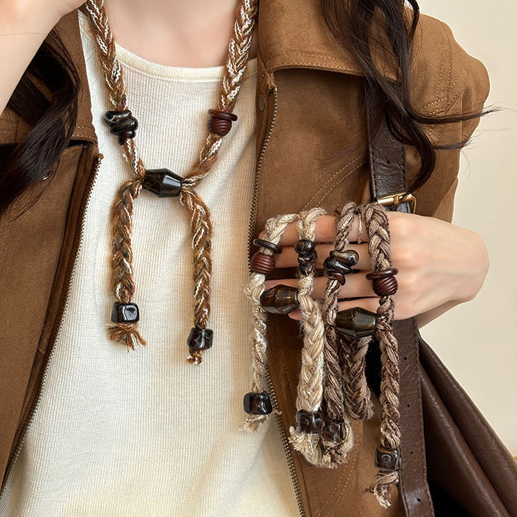 Maillard Contrast Color Beaded Wool Braided Necklace Women's Bohemian Ethnic Style Accessories Autumn and Winter Retro Sweater Chain