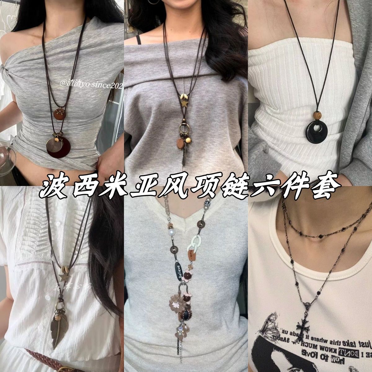 European and American Retro Vortex Totem Long Necklace Women's Trendy Bohemian Beach Style Personalized Stacked Leather Rope Clavicle Chain