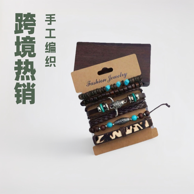 Cross-Border New Product Bohemian Style Wooden Beads Retro Flower Bull Head Eyes Feather Multi-Layer DIY 6-Piece Bracelet Set