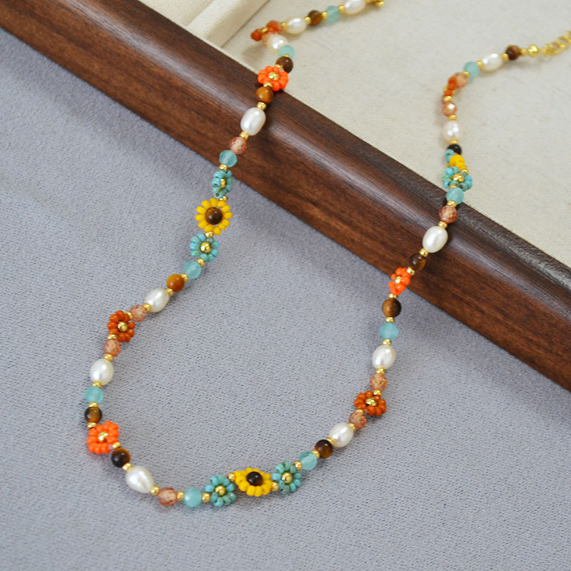 Vintage Retro Art Oil Painting Style Van Gogh Sunflower Bohemian Miyuki Seed Bead Pearl Necklace