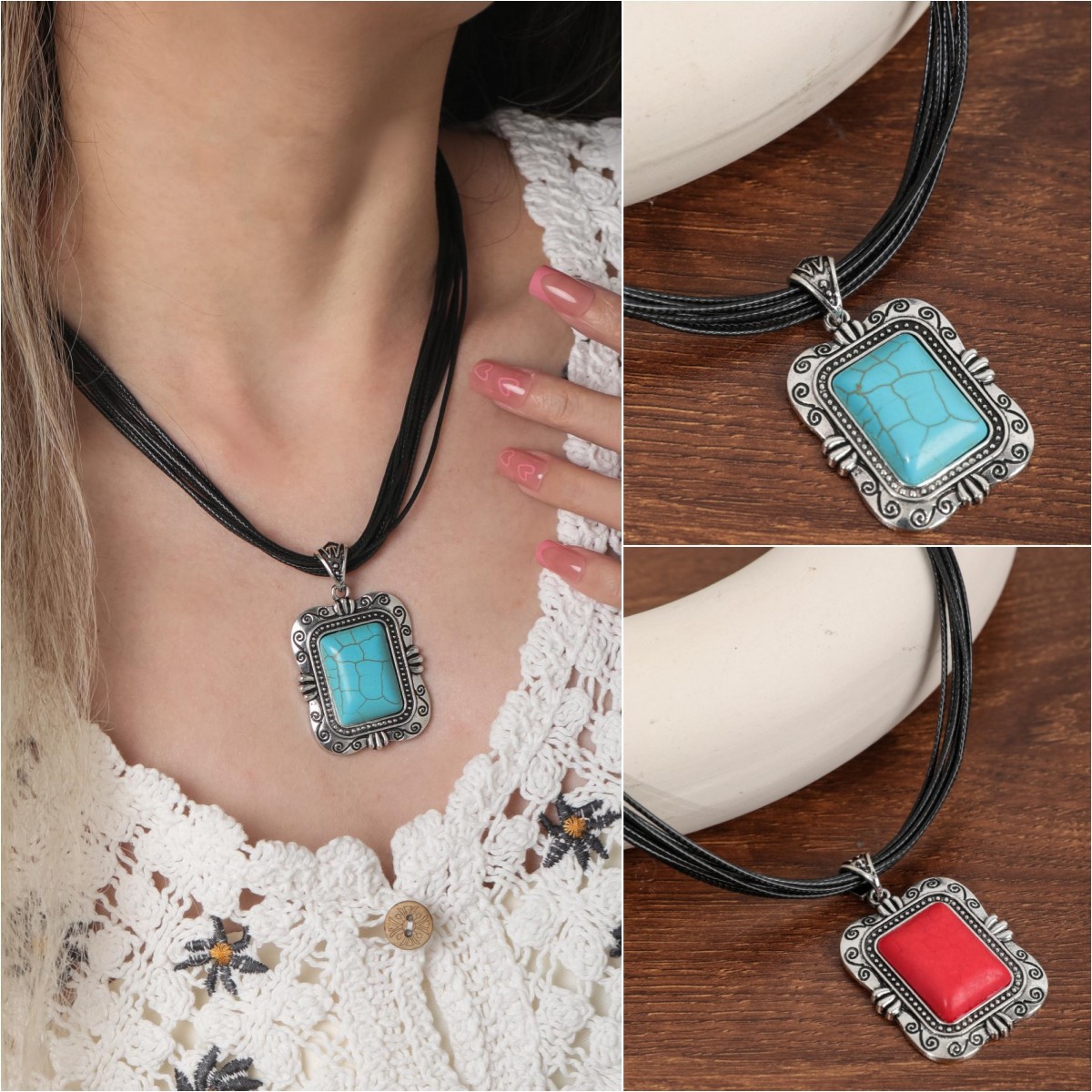 European and American cross-border bohemian Retro ethnic style turquoise necklace female personality square pendant clavicle chain wholesale
