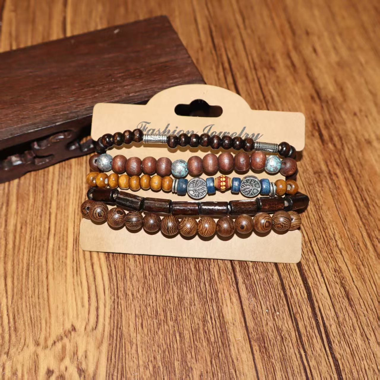 European and American Bohemian Style Literary Retro Wooden Bead Bracelet Set Multi-Layer Elastic Metal Tree of Life Bracelet Bracelet