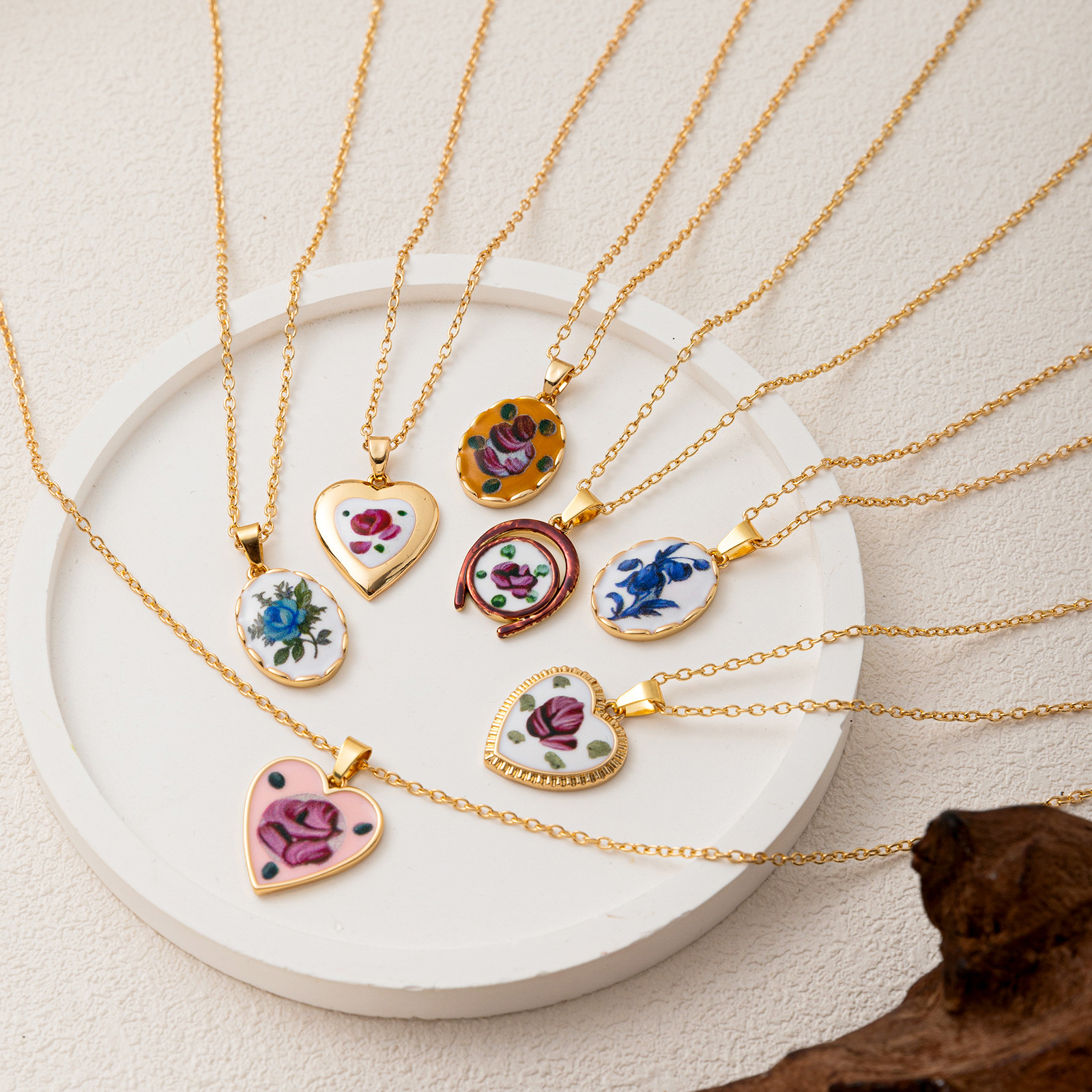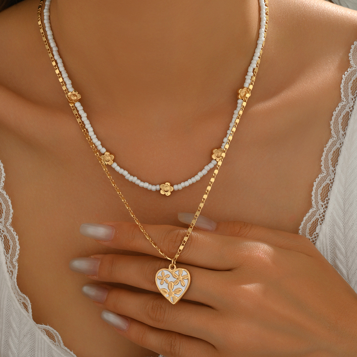 European and American Bohemian Style Oil Dripping Flower Heart Pendant Necklace Simple Elegant Rice Bead Clavicle Chain Export Jewelry
