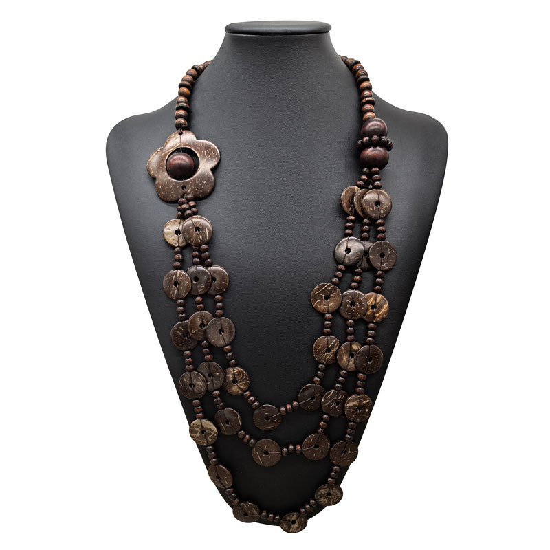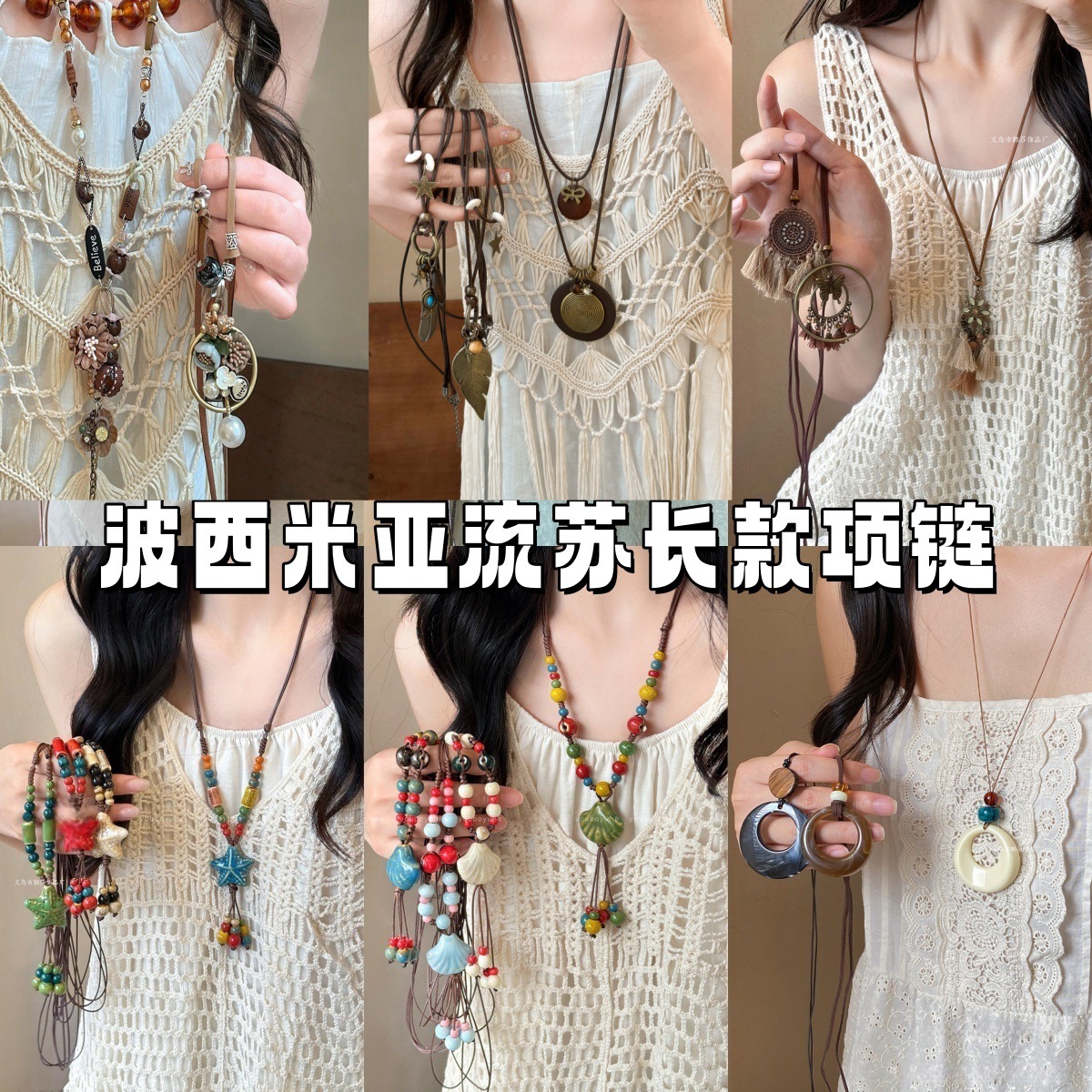 New Bohemian Coconut Shell Retro Multi-layer Long Wood Round Wooden Bead Beach Necklace Women's Woolen Chain