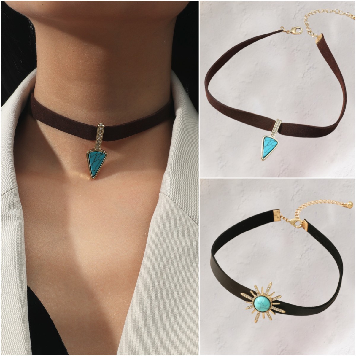 European and American bohemian Retro ethnic style turquoise personality sunflower triangle diamond necklace female necklace wholesale