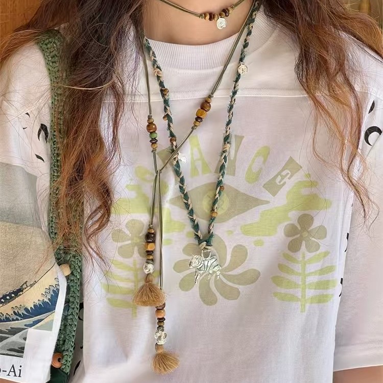Ethnic Style Elephant Beaded Rope Necklace Retro Versatile Bohemian Pendant Niche Design Long Necklace for Women
