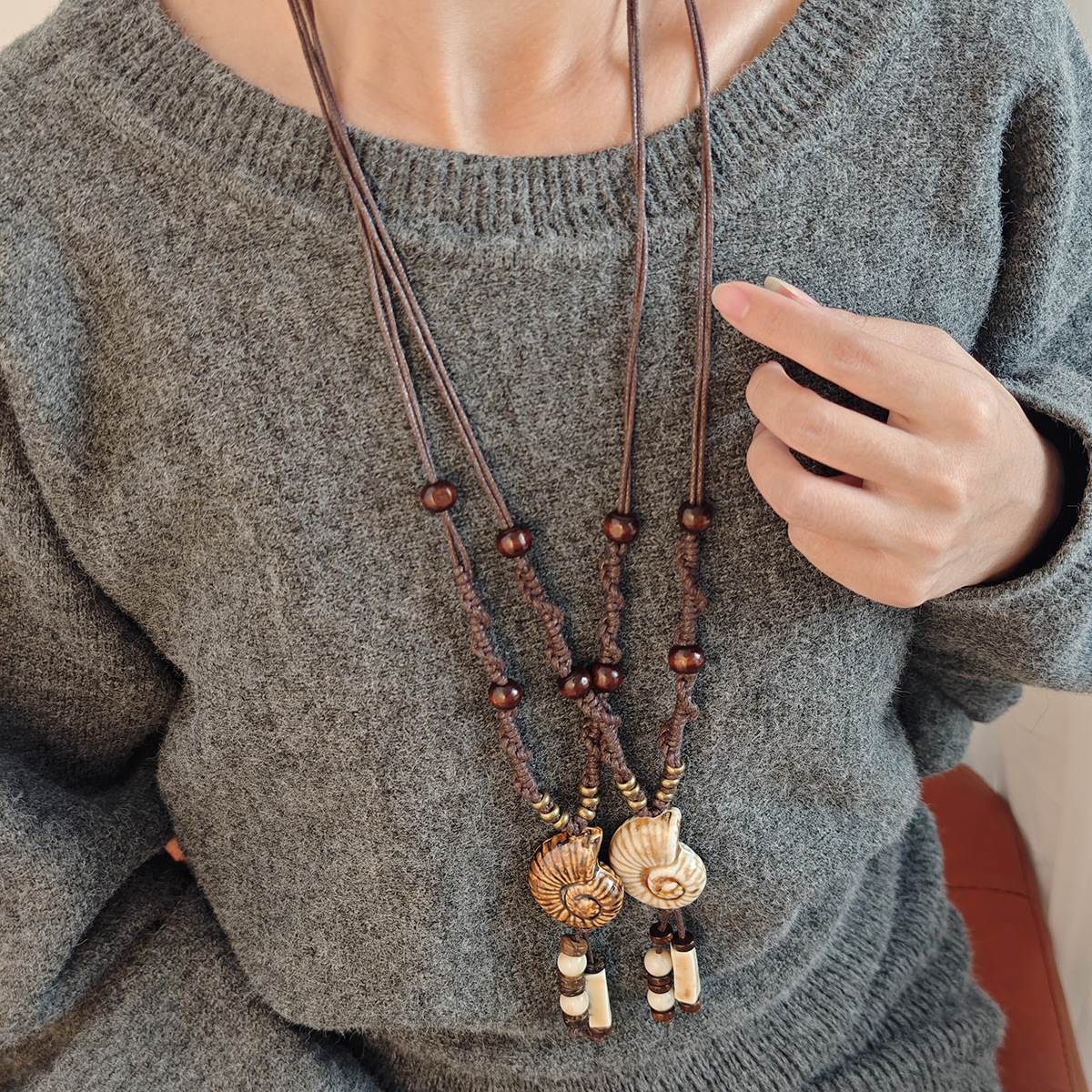 Vintage Bohemian Conch Pendant Long Necklace Autumn and Winter Ethnic Style Distinctive Woven Beaded Woolen Chain for Women