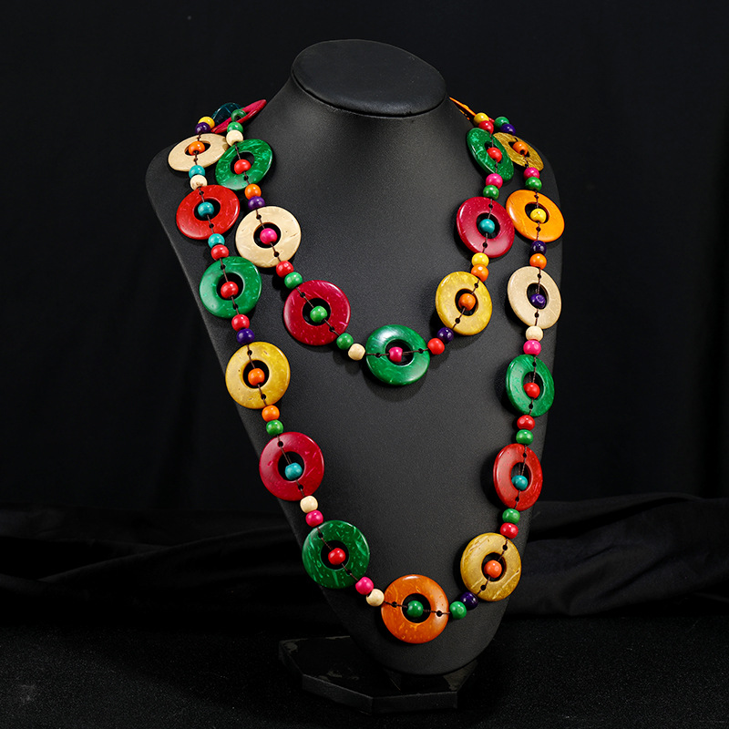 European and American Bohemian Color Coconut Shell Wooden Necklace Women's Retro Ethnic Style Double Layer Overlapped Long Pendant Accessories