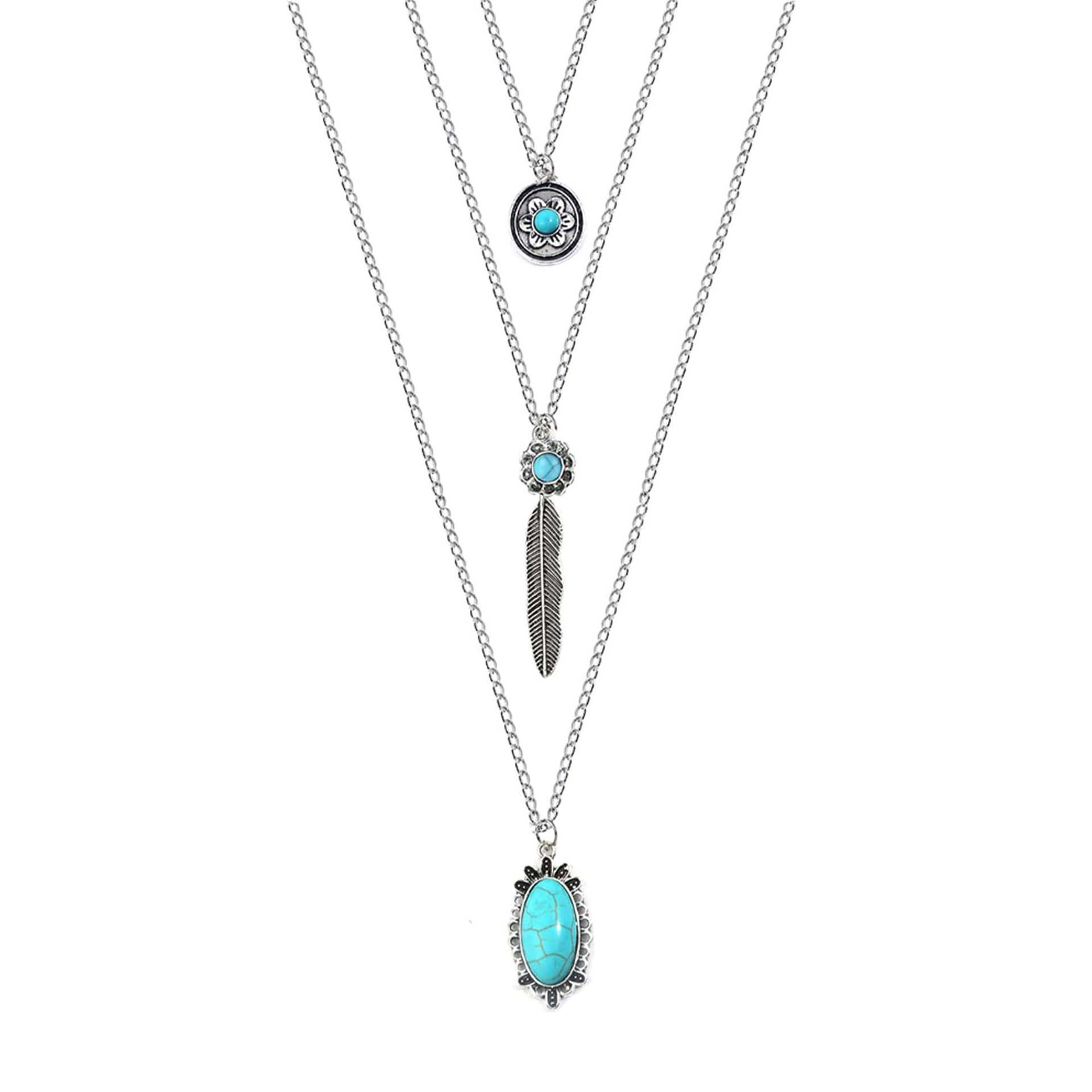European and American Leaf Round Turquoise Multi-Layer Necklace Women's Retro Versatile Bohemian Style Alloy Pendant Necklace