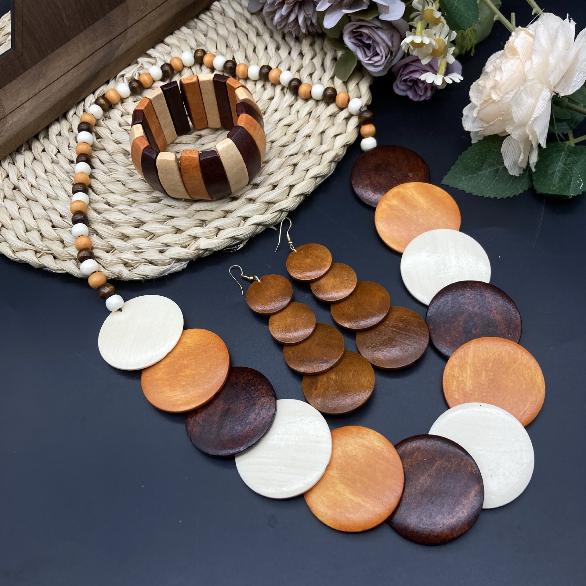 Cross-Border Hot Selling Ethnic Style Retro Wooden Jewelry Large Disc Necklace Earrings Bracelet Set Ready-Made Necklace