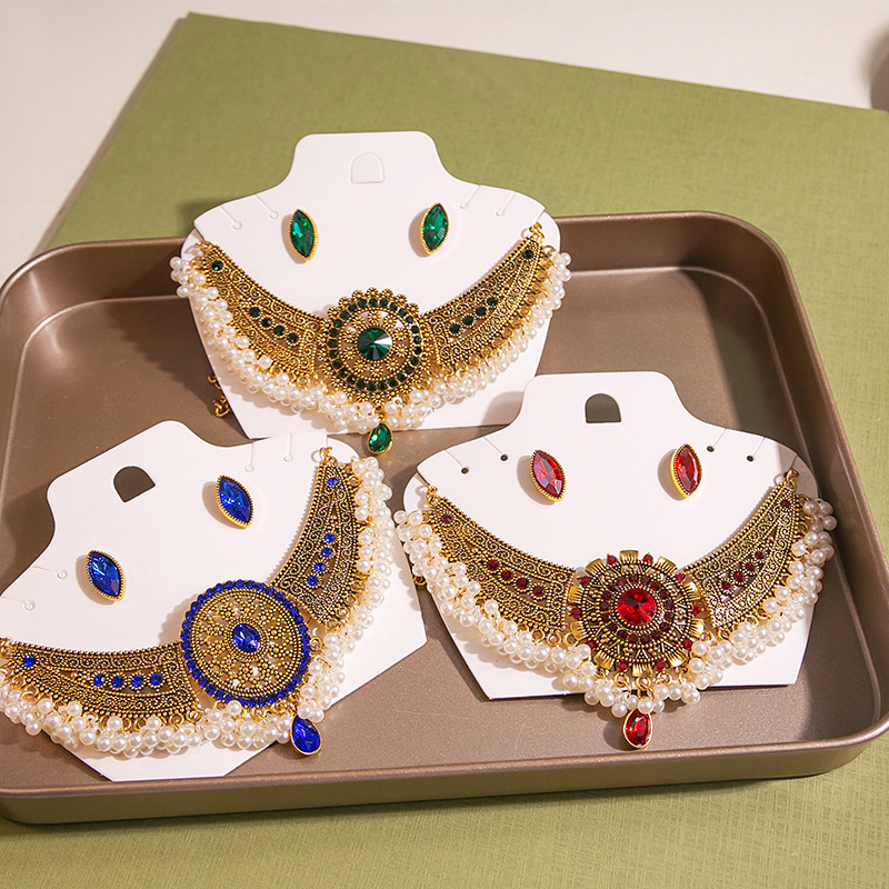 Retro Metal European and American Necklace Earrings Set New Bohemian Ethnic Style Round Diamond-encrusted Pearl Earrings