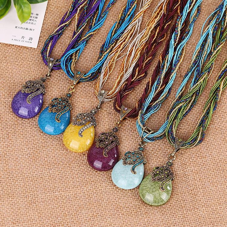 Bohemian Imitation Crystal Pendant Vintage Artistic Blue Circle Water Drop Necklace Woolen Chain Pendant Clothes Accessories
