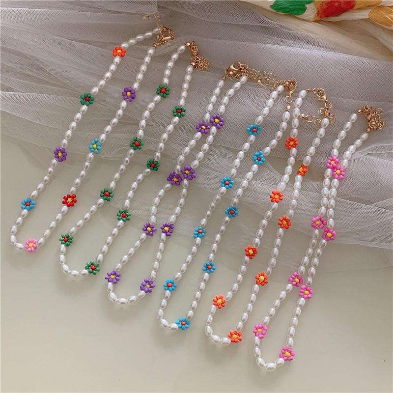Korean Retro Color Beaded Rice Beads Flower Necklace Girl Style Pearl Necklace Bohemian Flower Necklace