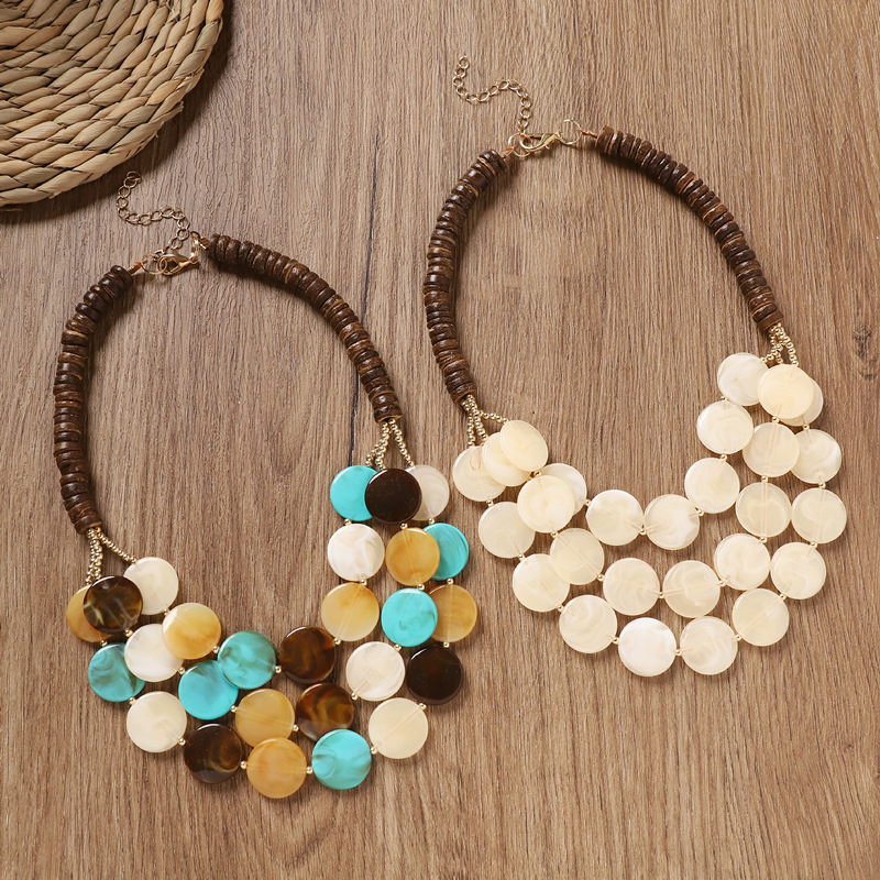 European and American Bohemian Color Coconut Shell Wooden Necklace Women's Retro Ethnic Style Double Layer Overlapped Long Pendant Accessories