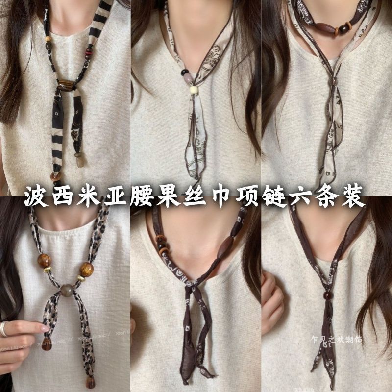 Bohemian Ethnic Style Cashew Silk Scarf Fabric Wooden Bead Necklace Women's Long Sweater Chain Halter Accessories Neck Necklace