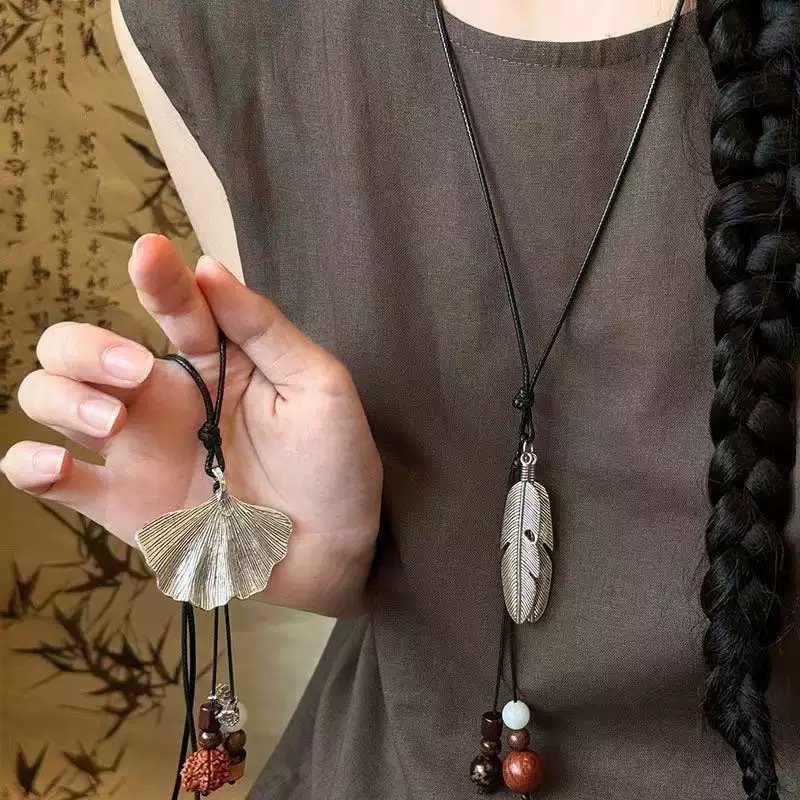 New Chinese Style Retro Feather Ginkgo Leaf Necklace Women's Bohemian Ethnic Style Long Sweater Chain Pendant Accessories