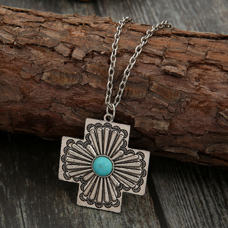 wish cross-border European and American new retro bohemian turquoise pendant exaggerated cross geometric necklace wholesale