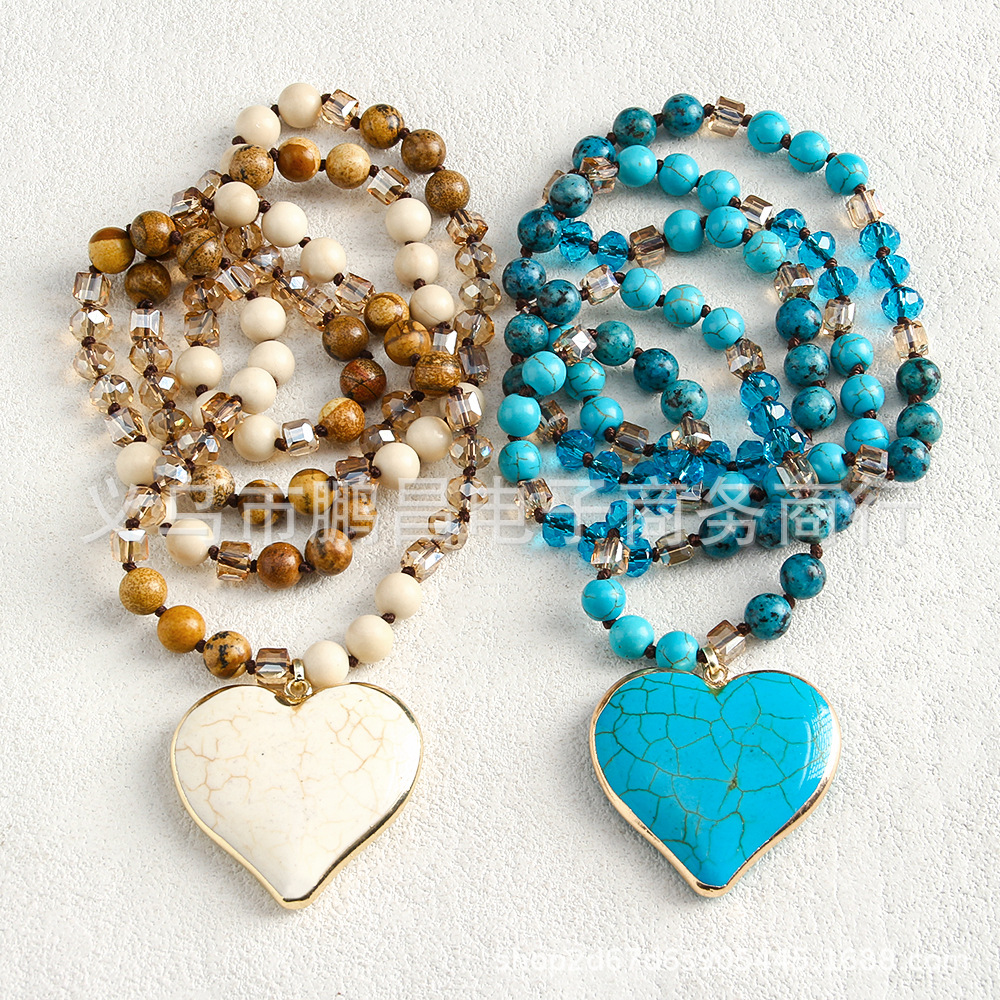 Retro Bohemian Style Women's 8mm Natural Stone Shiny Glass Knotted Necklace Sweater Chain Turquoise Heart Pendant