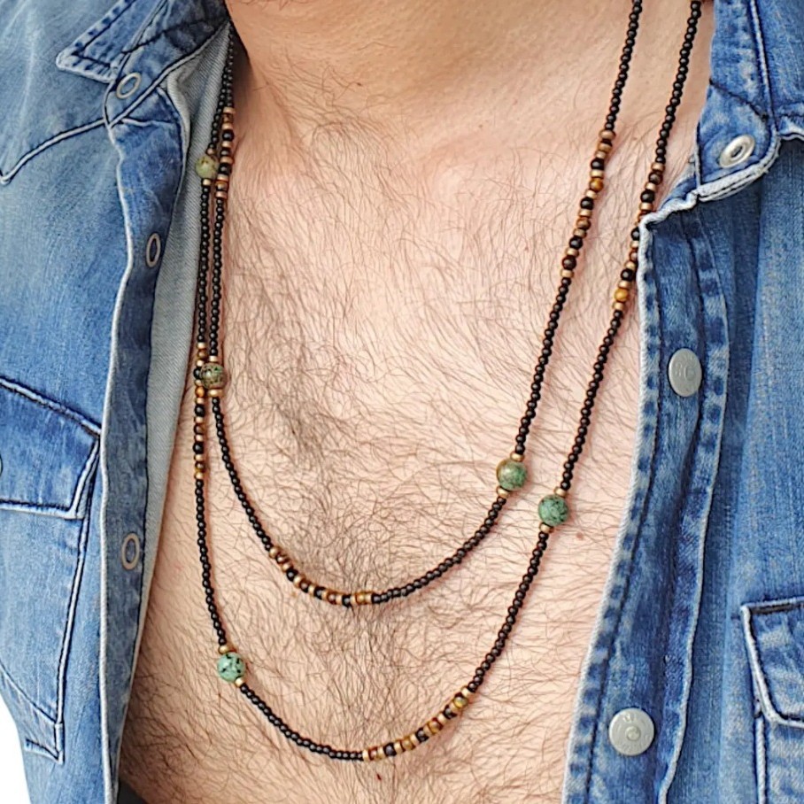 Bohemian Style Double-Layer Stacked Necklace Retro African Pine Black Agate Beaded Men's Sweater Chain Yiwu Jewelry