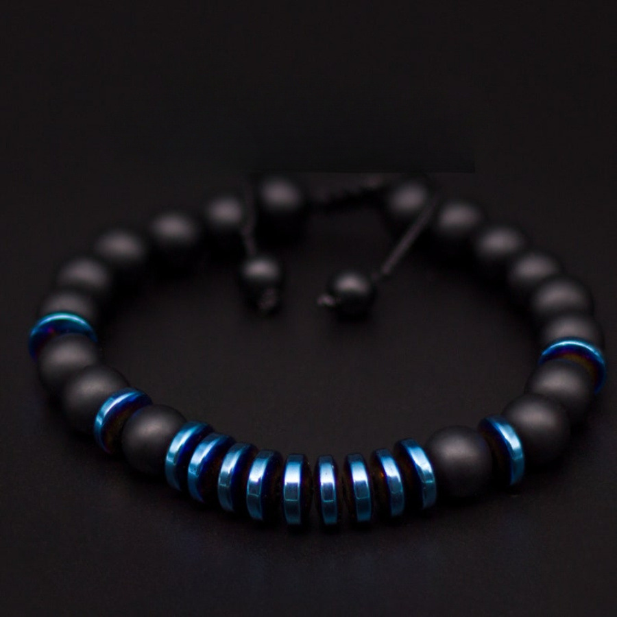 Matte Black Onyx and Blue Hematite Bead Bracelet, Men's Mysterious Black Bead Business Style for Men