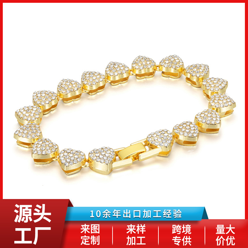 Customized Bracelet European and American Cross-Border New Product Heart-Shaped Full Diamond 10mm Cuban Bracelet Hip-Hop Style Alloy Men's and Women's Factory