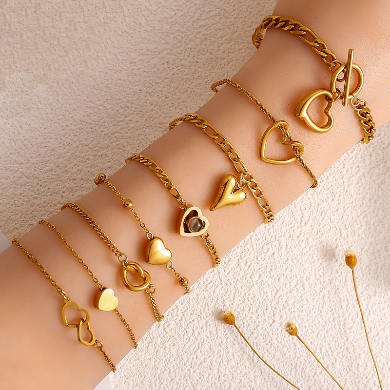 European and American Cross-Border Heart-Shaped Stainless Steel Bracelet Set for Women, Non-Fading Titanium Jewelry, Stackable Heart Chain Bracelet for Women