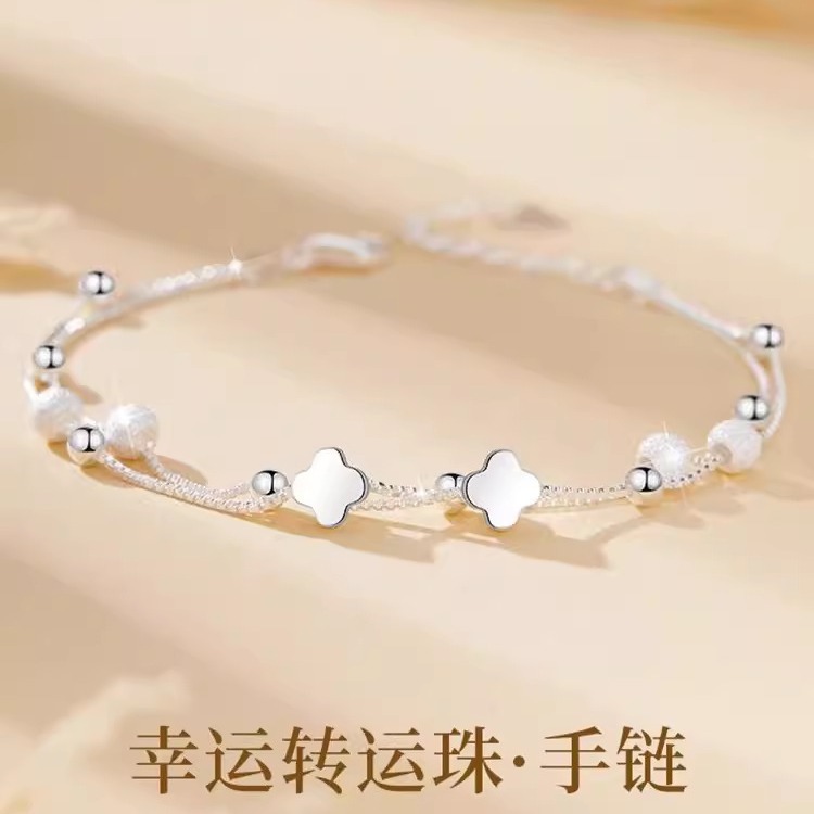 Double-layer Transfer Beads Four-leaf Clover Bracelet Women's Light Luxury Niche Design Sense Frosted Beads Lucky Grass Bracelet Girlfriend Gift