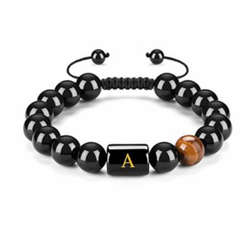 Amazon Cross-Border Best-Selling Black Agate Bracelet 26 Letters Natural Stone Braided Adjustable Bead Bracelet for Women Hot Style