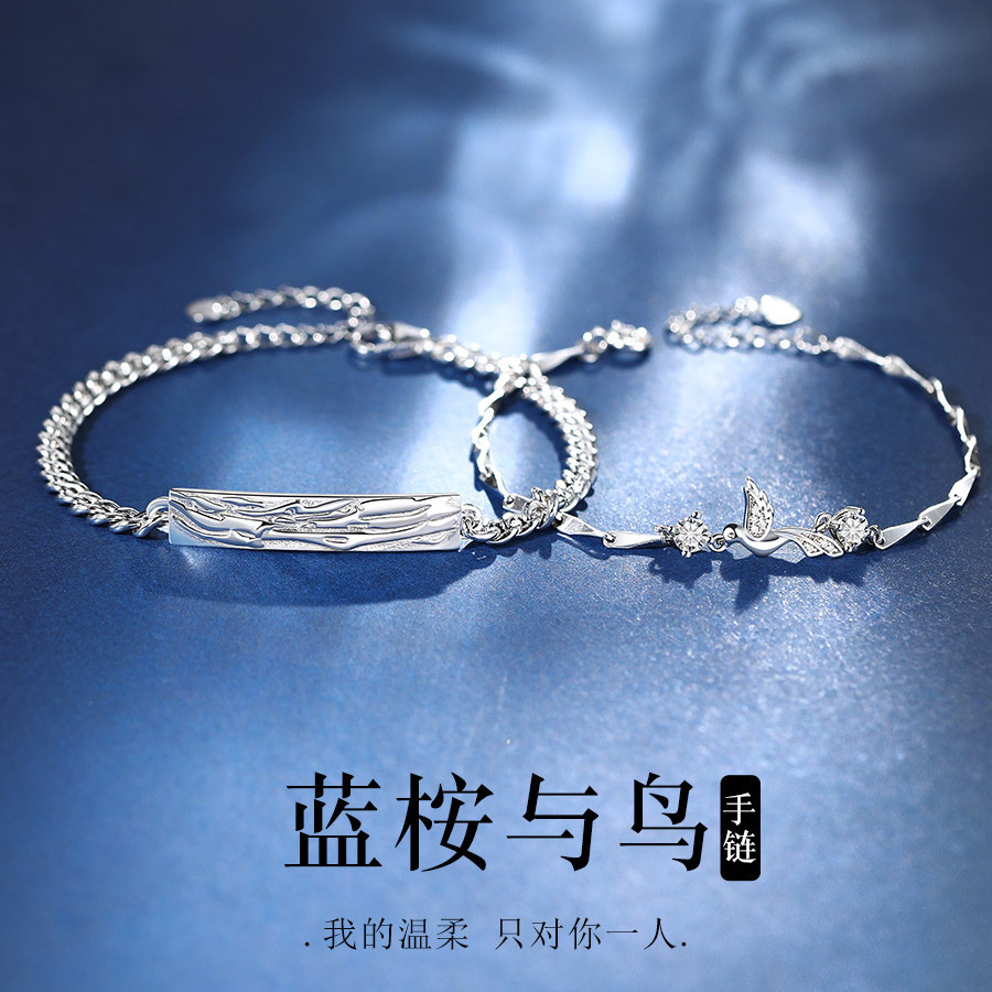 S925 Sterling Silver Blue Eucalyptus Tree and Bird Couple Bracelet, One for Men and One for Women, Silver Light Luxury Versatile High-End Jewelry Accessory